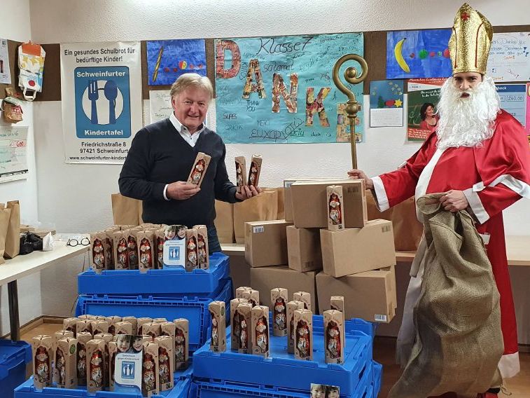 „Die Nikoläuse sind eine tolle Überraschung für unsere Kinder“, sagte der Leiter der Schweinfurter Kindertafel, Stefan Labus, bei der Spendenübergabe durch den Nikolaus der KjG. Die Schweinfurter Kindertafel hat es sich zur Aufgabe gemacht, bedürftigen Kindern eine ausgewogene und leckere Mahlzeit zu liefern. Deswegen bringen ehrenamtliche Helferinnen und Helfer jeden Morgen gesunde, selbst gemachte Pausenbrote in die Schweinfurter Schulen und Kindergärten. Das geschieht seit 2009 in ehrenamtlicher Arbeit und wird ausschließlich durch Spenden finanziert.