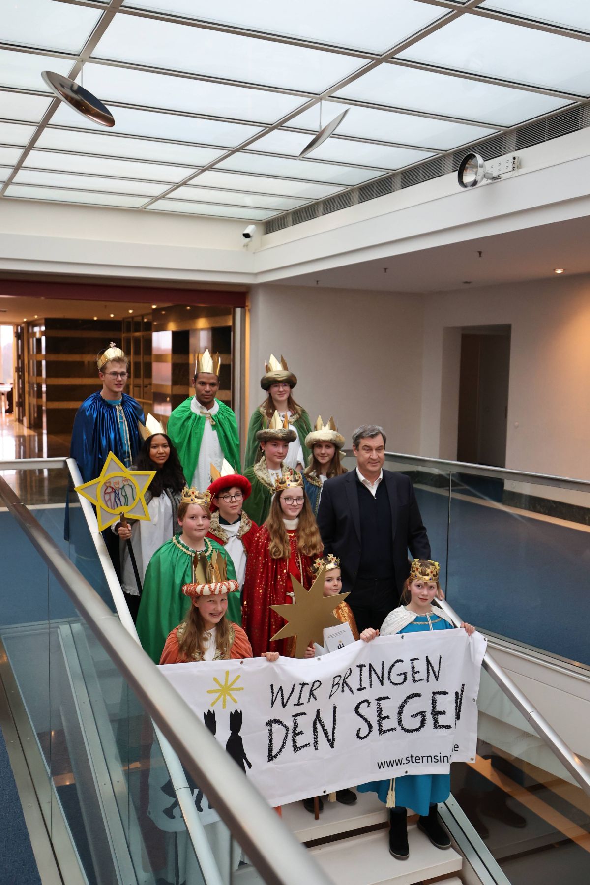 „Auch in Bayern spüren wir den Klimawandel deutlich“, sagte Söder. Beispielsweise sei hier der Rückgang des Trinkwassers deutlich zu spüren, auch wenn dieser weniger drastisch sei als in anderen Teilen der Welt. Deswegen seien die Anliegen seiner Besucher auch seine eigenen. Er freue sich über den Einsatz der Sternsinger, die im Dienst für die Umwelt wie auch im Einsatz für Kinder in Not ihre Freizeit opferten. Bayern sei als Staat zwar weltanschaulich neutral. Er finde aber, dass der Glaube an Gott und die Pflege von Traditionen wie der des Sternsingens wichtig für den Zusammenhalt in einer Welt seien, die zunehmend polarisiert erscheine, sagte Söder und gab den Sternsingern eine Spende mit.